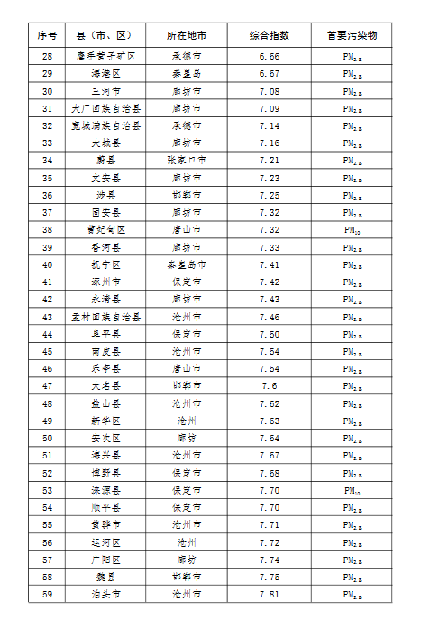上半年,除去張家口和承德兩市所轄縣(市、區(qū)),全省空氣質(zhì)量相對較好的前10個縣(市、區(qū))依次是:青龍滿族自治縣、秦皇島市北戴河區(qū)、秦皇島市山海關區(qū)、秦皇島市海港區(qū)、三河市、大廣回族自治縣、大城縣,文安縣、涉縣、固安縣。
