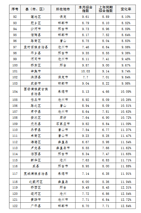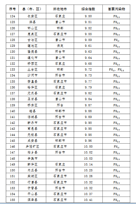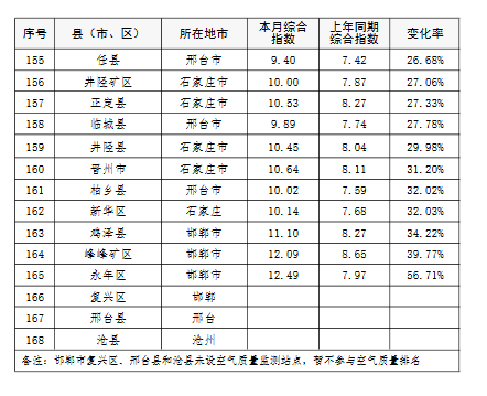 上半年,除去張家口和承德兩市所轄縣(市、區(qū)),全省空氣質(zhì)量相對較差的10個縣(市、區(qū)),按污染由重到輕的順序排名,依次是:邯鄲市永年區(qū)、邯鄲市峰峰礦區(qū)、雞澤縣、晉州市、趙縣、靈壽縣、石家莊市藁城區(qū)、正定縣、唐山市開平區(qū)、井陘縣。